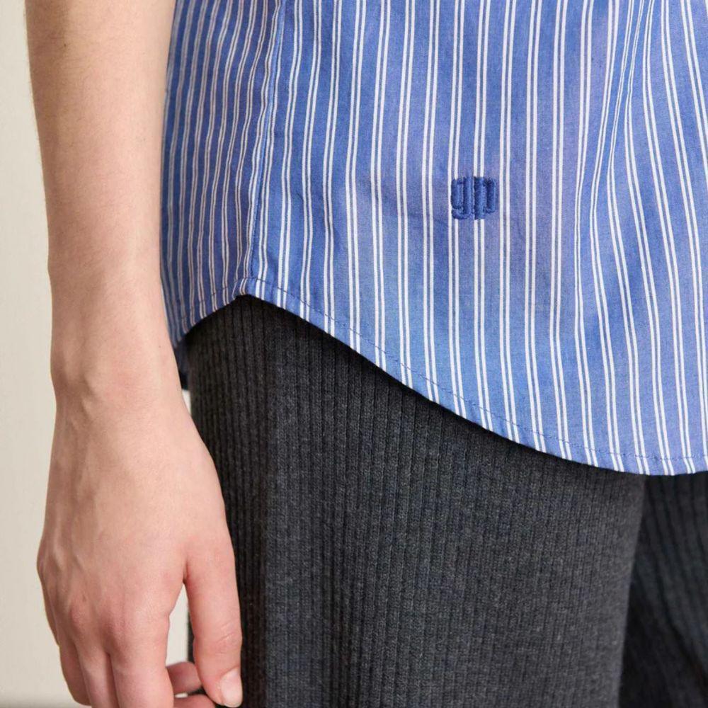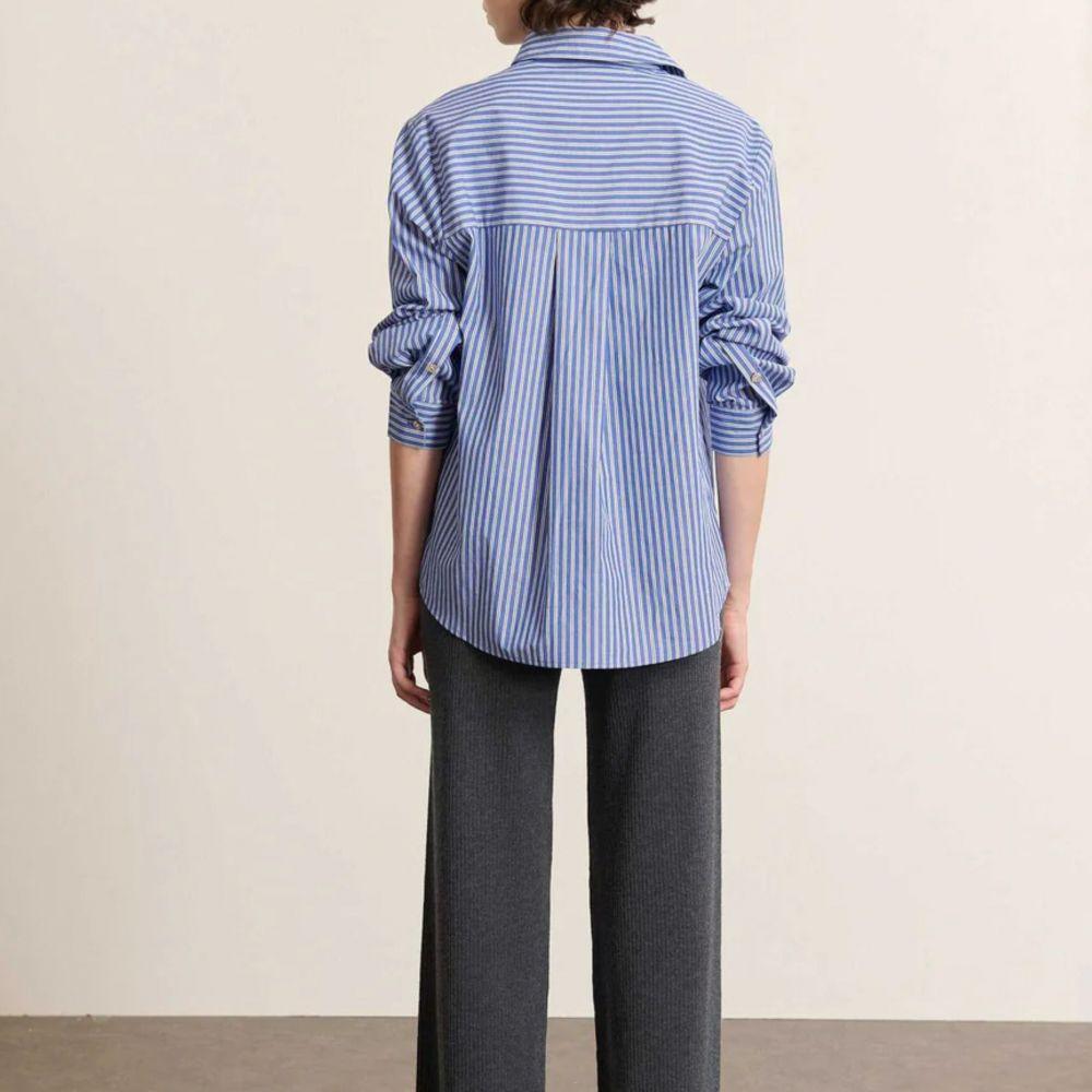 TED revisite la chemise rayée bleue avec légèreté et justesse. Sa coupe ajustée accompagne les mouvements, tandis que les boutons en nacre se fondent discrètement dans la matière. La découpe au dos ajoute un détail subtil qui signe une élégance contemporaine.