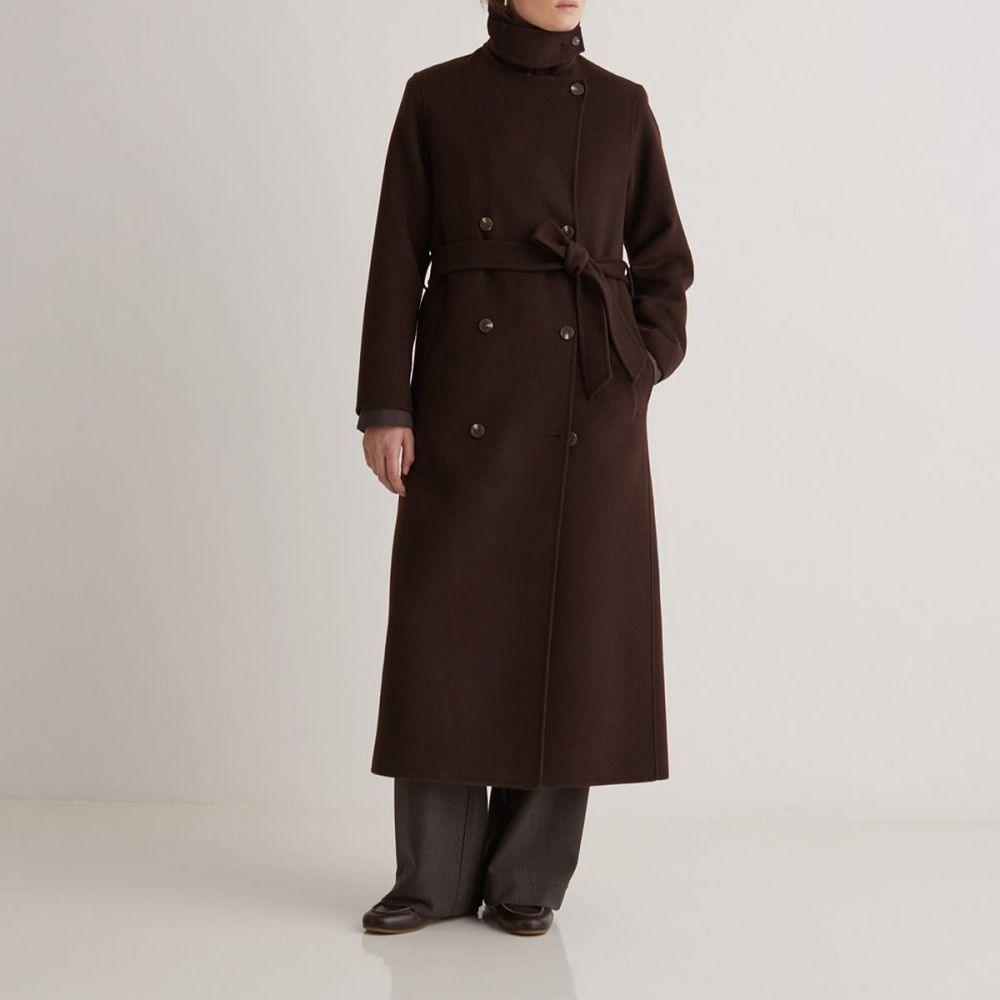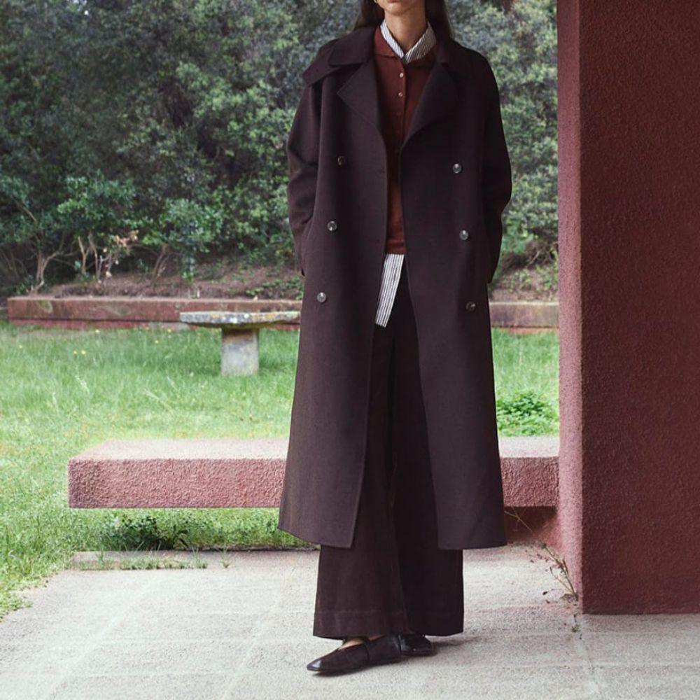 Manteau long confectionné à la main, à la coupe droite pour une silhouette élégante. Réalisé en tissu double face associant laine et fibres recyclées, il est sans doublure et se porte avec une ceinture amovible à nouer. Il présente une fente au dos, un col à revers avec bande et bouton, des manches longues, une fermeture à double boutonnage et deux poches latérales.